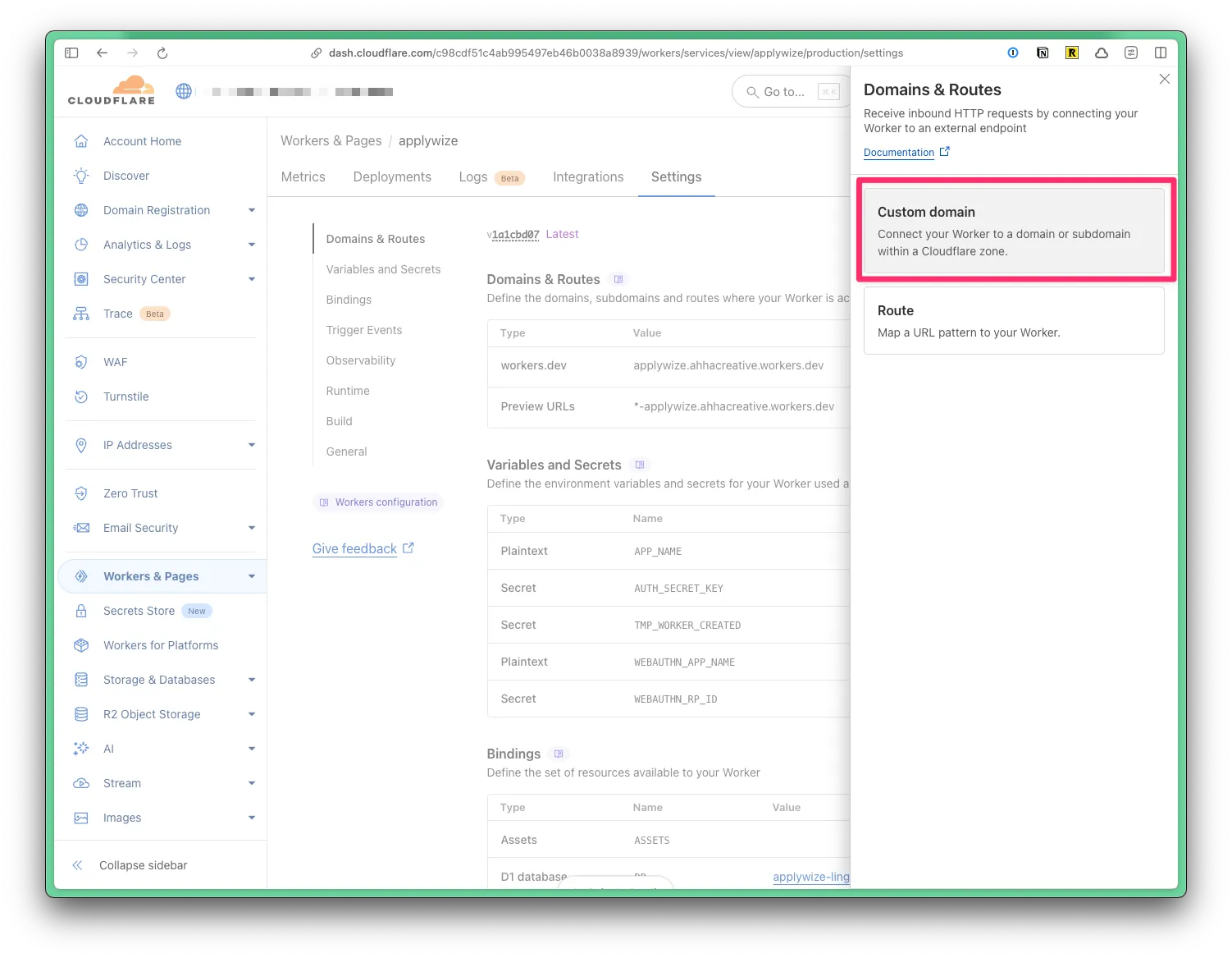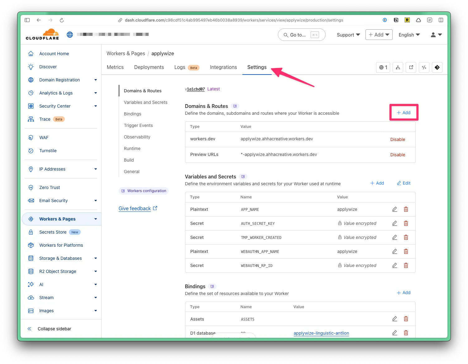 Section titled “Hooking Up your Domain Name to your Project”To use a domain name that’s registered to your Cloudflare account, go to Workers & Pages in the left side navigation. Then, click on the name of your project. Click on the Settings tab. At the top, you’ll see the domains associated with your project.